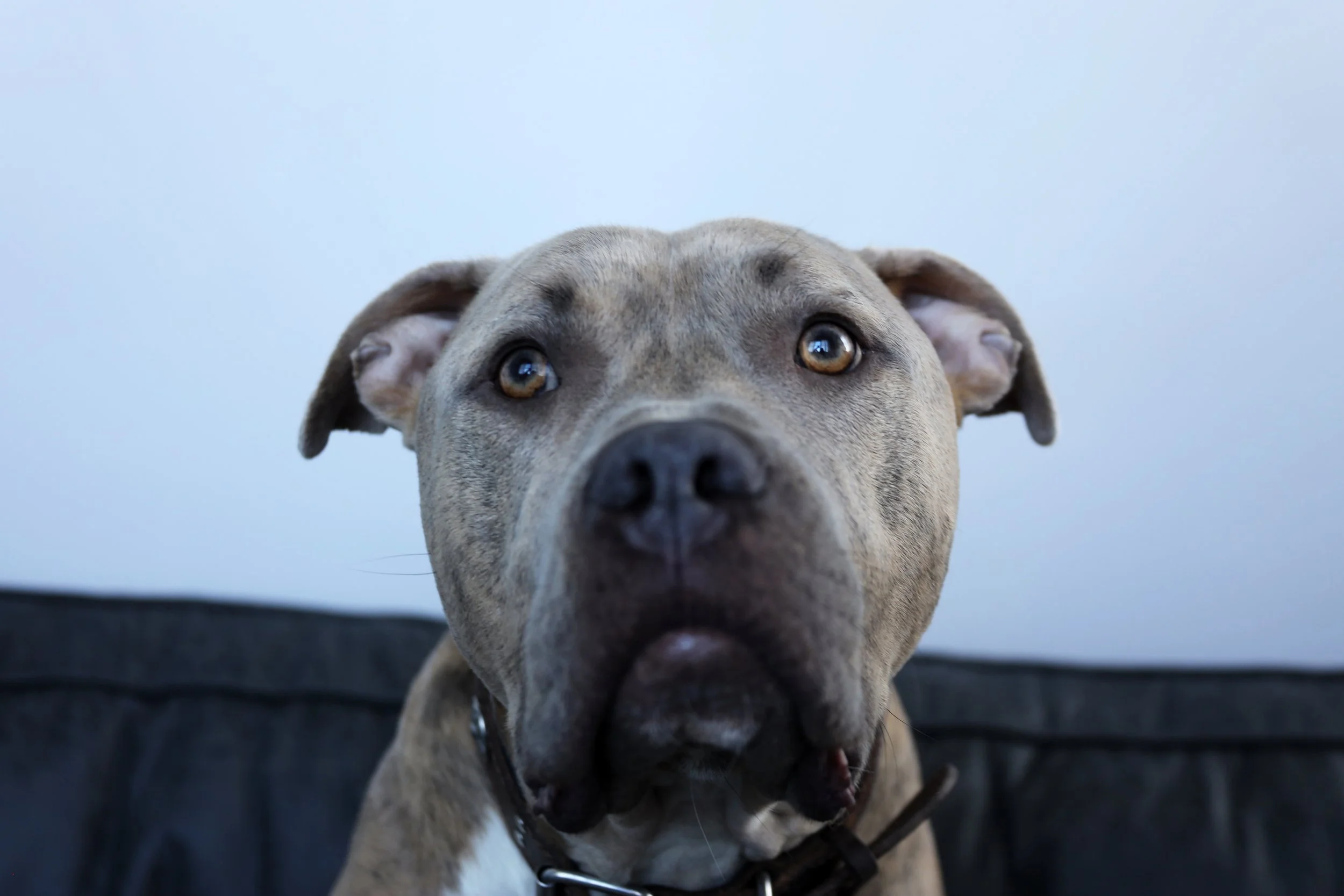 Amos is a loving, rescued blockhead weighing in at 80 lb. This gentle giant loves cuddles, burrowing under blankets, belly rubs, and chewing on extra durable toys.